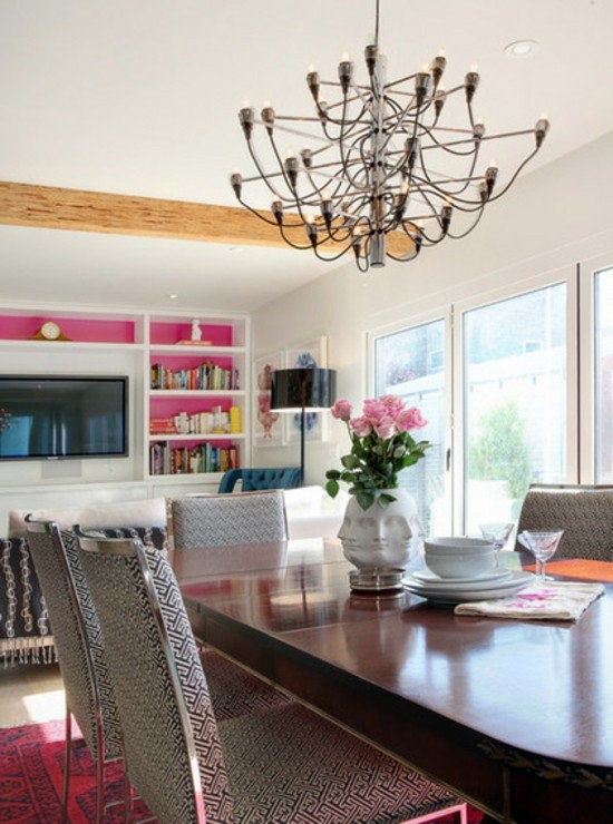 A Striking Example Of Interior Design Using Pink And Grey. A grey and pink lounge set up is situated within plain white walls. Pink is the colour of the moment.